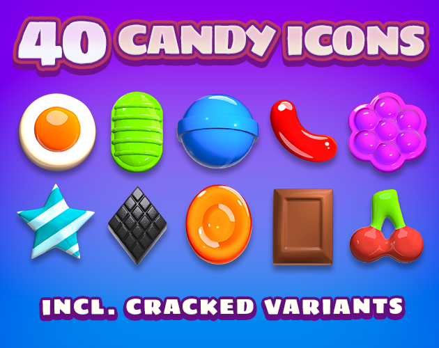 This pack includes 40 candy sprites, featuring both clean and cracked variations, making it easy to represent gameplay states such as damage, matching, or destruction.